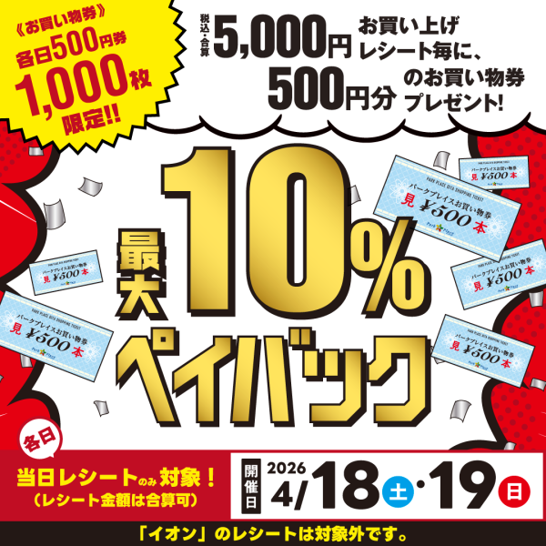 お買上げレシート税込5,000円分(合算可)ごとに、その日から使えるパークプレイス大分お買い物券500円分をプレゼント!