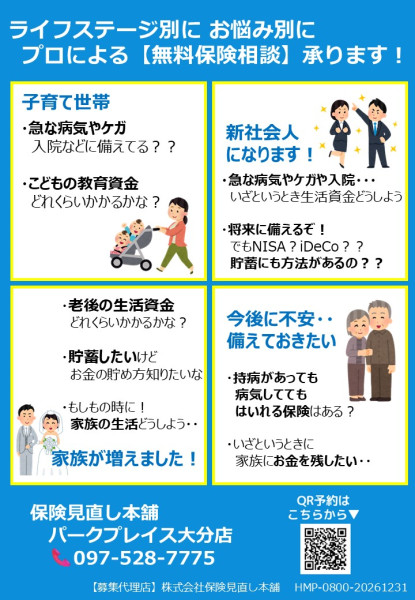 保険といっても、種類は様々保険をご検討されるうえで、どのような備えをお考えかで種類が変わってきます!まずは、お考えの備えについてお聞かせください♪プロのアドバイザーがお客様の目的に合わせた、保険選びのお手伝いをさせて頂きます!年齢・性別・家族構成・生活環境など、お客様一人ひとりの状況は同じではありません。保険見直し本舗は、取扱保険会社40社以上!お客様のニーズに合わせた「オーダーメイド」のご提案をさせて頂きます♪☆★サービスは全て無料です★☆保険見直し本舗 パークプレイス大分店TEL:097-528-7775募集代理店:株式会社保険見直し本舗【HMP-0887-20270131】