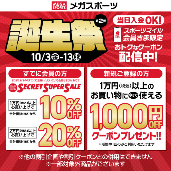 1995年にスタートした私たちは、2025年、「メガスポーツ」へ名前を変更し新たなスタートを切りました。変わらぬ信頼と新しい名を胸に、もう一度走り出します。日頃のご愛顧に感謝して、【誕生祭 第2弾】を開催!店舗でご利用いただける特別クーポンをご用意しました。■スポーツマイル会員の方※2025年9月24日(水)までにご登録いただいている方が対象です・1万円(税込)以上のお買い上げで、合計金額(税込)から【10%OFF】・2万円(税込)以上のお買い上げで、合計金額(税込)から【20%OFF】■新規ご登録の方\当日入会OK/・1万円(税込)以上のお買い上げで、合計金額(税込)から【1,000円OFF】※他の割引企画や割引クーポンとの併用はできません※一部対象外商品がございますみなさまのご来店を心よりお待ちしております。