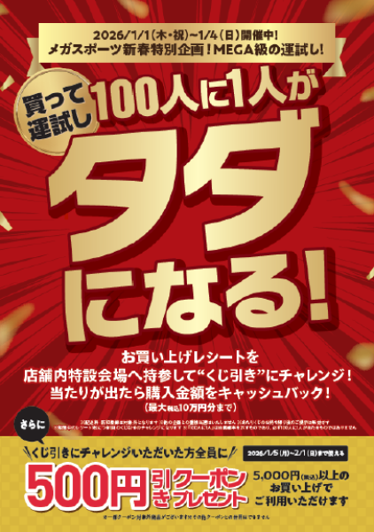お買い上げレシートを店舗内特設会場へ持参して"くじ引き"にチャレンジ!当たりが出たら購入金額をキャッシュバック!(最大税込10万円分まで)さらにくじ引きのチャレンジいただいた方全員に500円引きクーポンプレゼント!