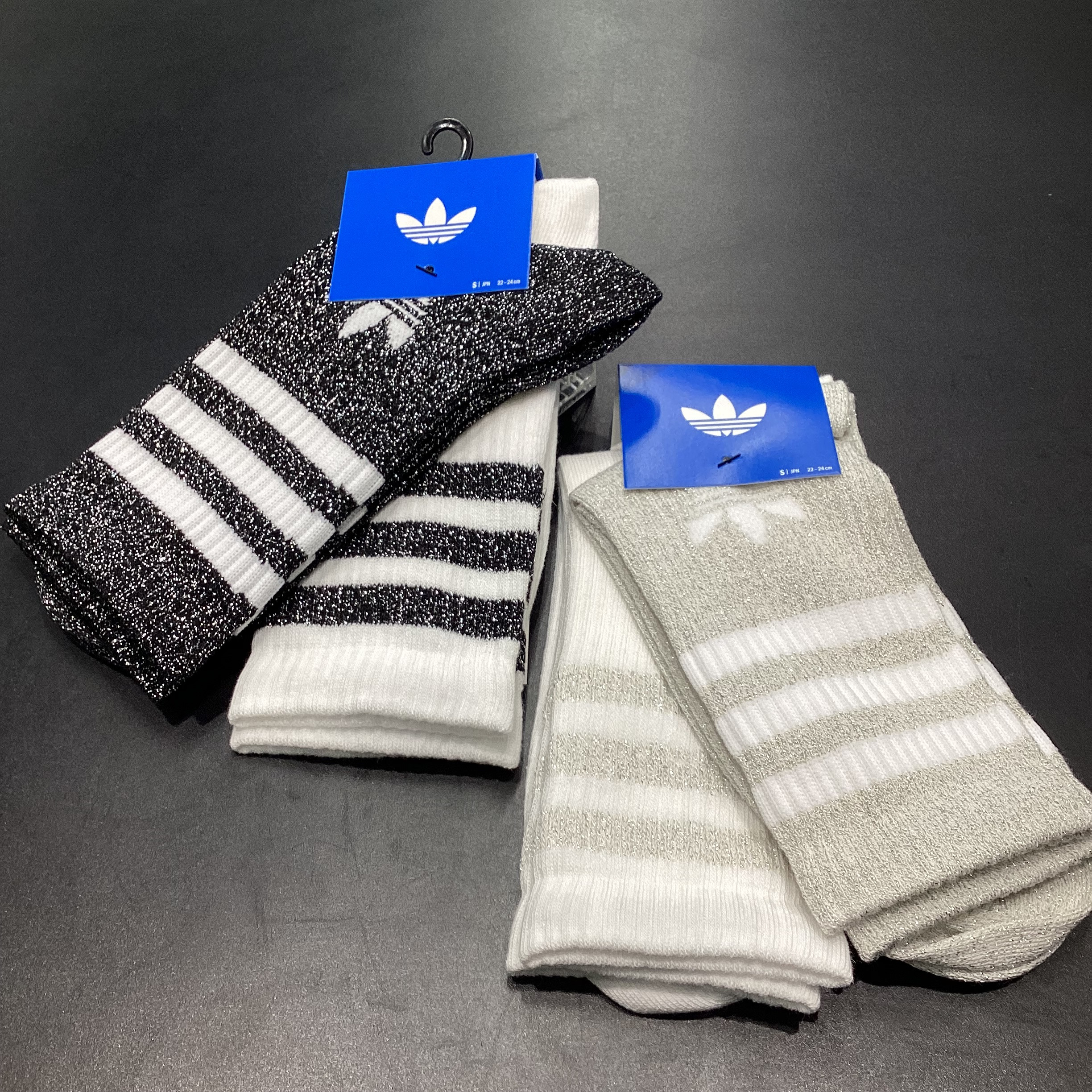 【adidas Originals】3S GLITTER CR 2¥2,530-Colour : アイスゴールドメタリック/ブラックSize :S/MModel number:KA985 KD0965/KA985 JV6049このアイテムの最大の魅力は、表情の異なる2足がセットになっていること。 1足は、履き口の3本ラインとトレフォイルロゴにラメをあしらった「さりげない輝き」が特徴。もう1足は、全体にグリッターを編み込み、どこから見ても華やかな「主役級」のデザインです。アイスゴールドは、肌馴染みが良く、足元をパッと明るく見せてくれる上品なカラー。ブラックは、モードな雰囲気で、サンダルやスニーカーとの相性も抜群な万能カラー。ストレッチの効いたリブ素材で履き心地も快適。自分用にはもちろん、ちょっとしたギフトにも喜ばれること間違いなしの注目アイテムです。ぜひ店頭で、この絶妙な輝きをチェックしてみてください!