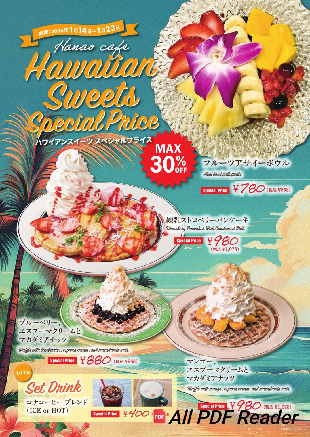 HANAO CAFE大分店にご来店頂きありがとうございます。ただいまの期間ハワイアンフェアと題しまして期間限定商品4点販売中です。この機会に是非ご来店をお待ちしております。