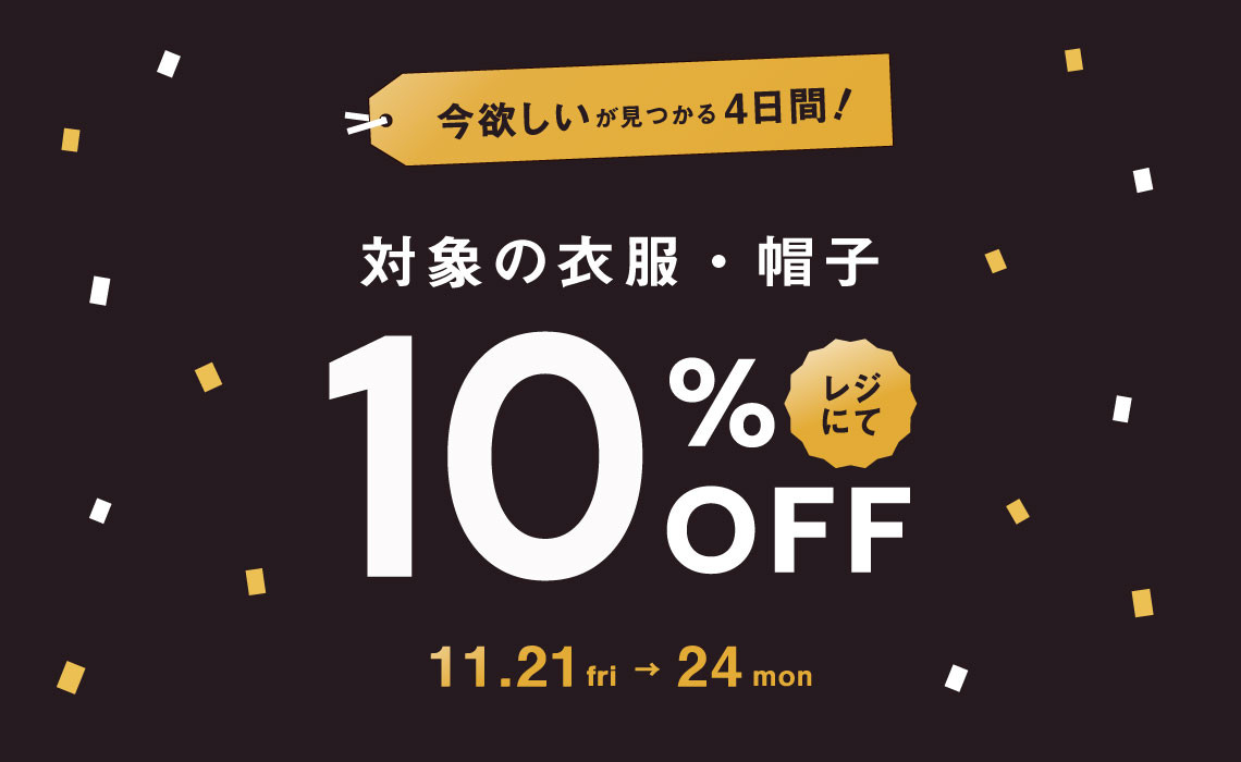 期間中、対象の衣服と帽子が10%OFFになります。