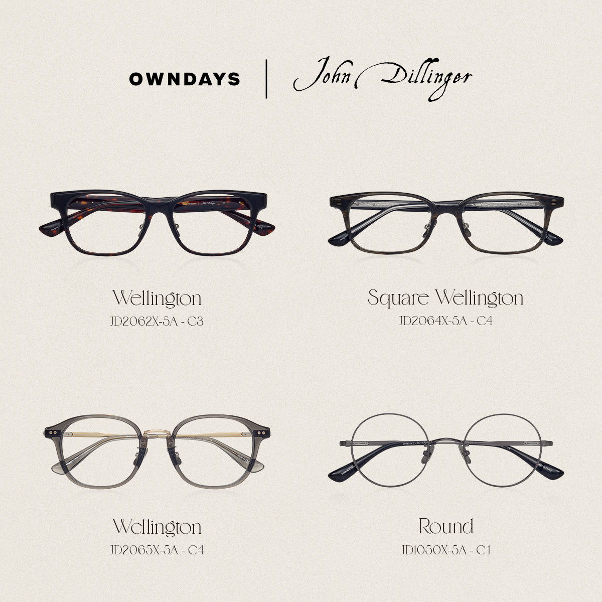 NEW ARRIVALレトロな趣を基調に、時代の変化を細やかな装飾で織りなす「John Dillinger(ジョンデリンジャー)」シリーズ。そんな人気シリーズから、「現代のヴィンテージ」をテーマにした新作4型が登場です。◼︎ JD2062X-5A ¥13,000(税込)力強い印象を放つ、こだわりのウェリントン型。角ばりつつも柔らかなフォルムが、現代的な上品さを演出。◼︎ JD2064X-5A ¥13,000(税込)伝統と現代的なラインが融合したスクエアウェリントン型。知性を引き立てるシャープな形状で、キリッとした表情に。◼︎ JD2065X-5A ¥13,000(税込)柔らかな表情をまとう、上品なウェリントン型。随所にあしらわれたメタルの光沢が、スタイリッシュさをプラス。◼︎ JD1050X-5A ¥13,000(税込)顔立ちを自然に引き立てる、ミニマルなラウンド型。無駄を削ぎ落としたシンプルさが高級感を生み、幅広いシーンで活躍。ぜひ店頭にてお試しください!みなさまのご来店をお待ちしております。▼詳細はこちらhttps://www.owndays.com/jp/ja/products?stocks=true&productLines[]=1&page=1https://www.owndays.com/jp/ja/products?stocks=true&productLines[]=1&page=1