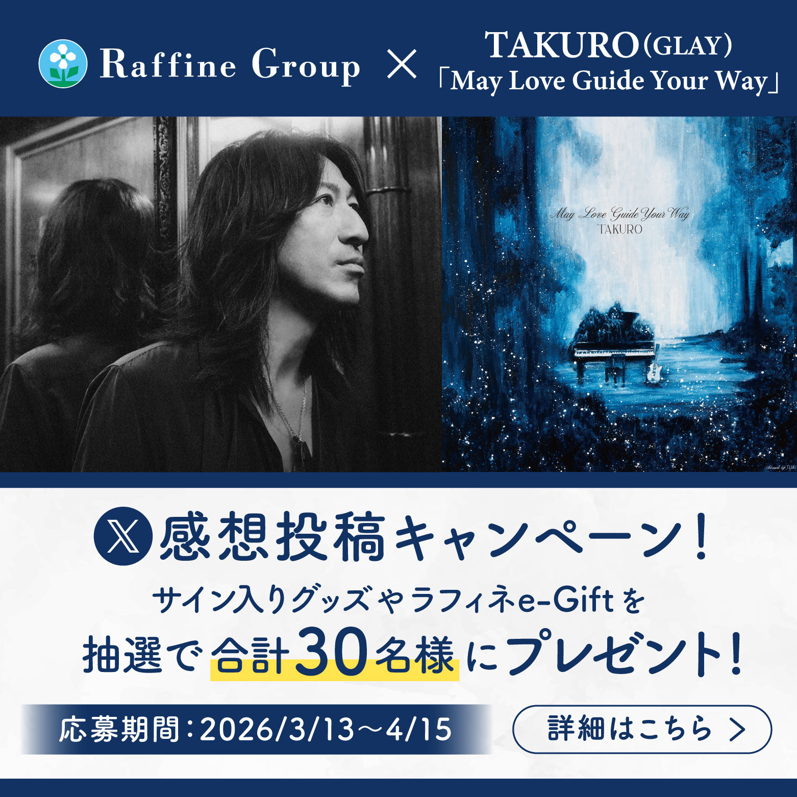 GLAY TAKURO氏による前作のヒーリングアルバム『The Sound Of Life』リリース時にも大きな反響をいただいた本コラボキャンペーン。今回、2026年3月18日(水)リリースの同氏のヒーリングアルバム第二弾『May Love Guide Your Way』でも再コラボレーションが実現いたしました!本コラボレーションは、音楽を“聴く”だけでなく、リラクゼーションという癒やしの体験の中で感じてほしい――TAKURO氏のそんな想いと、心と体に寄り添う時間を届けるラフィネグループの姿勢が重なり生まれました。施術空間に広がるヒーリングアルバムの世界観を、ラフィネグループならではの癒やしとともにお届けします。ぜひこの機会に、音楽と癒やしが重なるひとときをご体感ください。企画詳細①2026/3/13(金)から2026/4/15(水)までの期間限定で、全国のラフィネグループ店舗のBGMとして『May Love Guide Your Way』の楽曲(全編)が流れます。アルバム発売開始前にいち早く作品を聴いていただける貴重なチャンスです。ぜひお早めにご予約ください!企画詳細②全国のラフィネグループ店舗で施術を受けてXで #ラフィネTAKURO をつけて感想を投稿しよう!抽選でプレゼントが当たるキャンペーン!投稿期間:2026/3/13(金)から2026/4/15(水) 23:59キャンペーン賞品■サイン入りポスター:10名様■サイン入りCD:10名様■サイン入りオリジナルポストカード:5名様■限定デザイン ラフィネ e-Gift(2,300円分):5名様応募方法①ラフィネの公式Xアカウント(@bodyworkholding)をフォロー ②ハッシュタグ #ラフィネTAKURO をつけて実際にラフィネグループ店舗で施術を受けた感想をXに投稿皆様のご応募お待ちしております♪